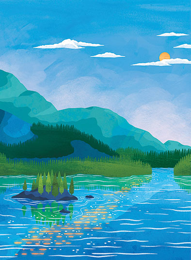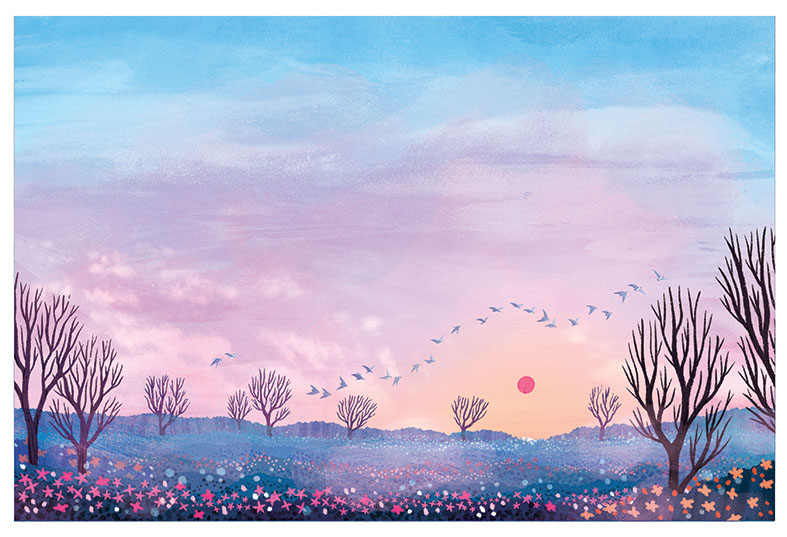 Amy said ‘What a joy to draw so many atmospheric landscapes and nature scenes for this one, I had a lot of fun trying to capture a peaceful mood in the colours’