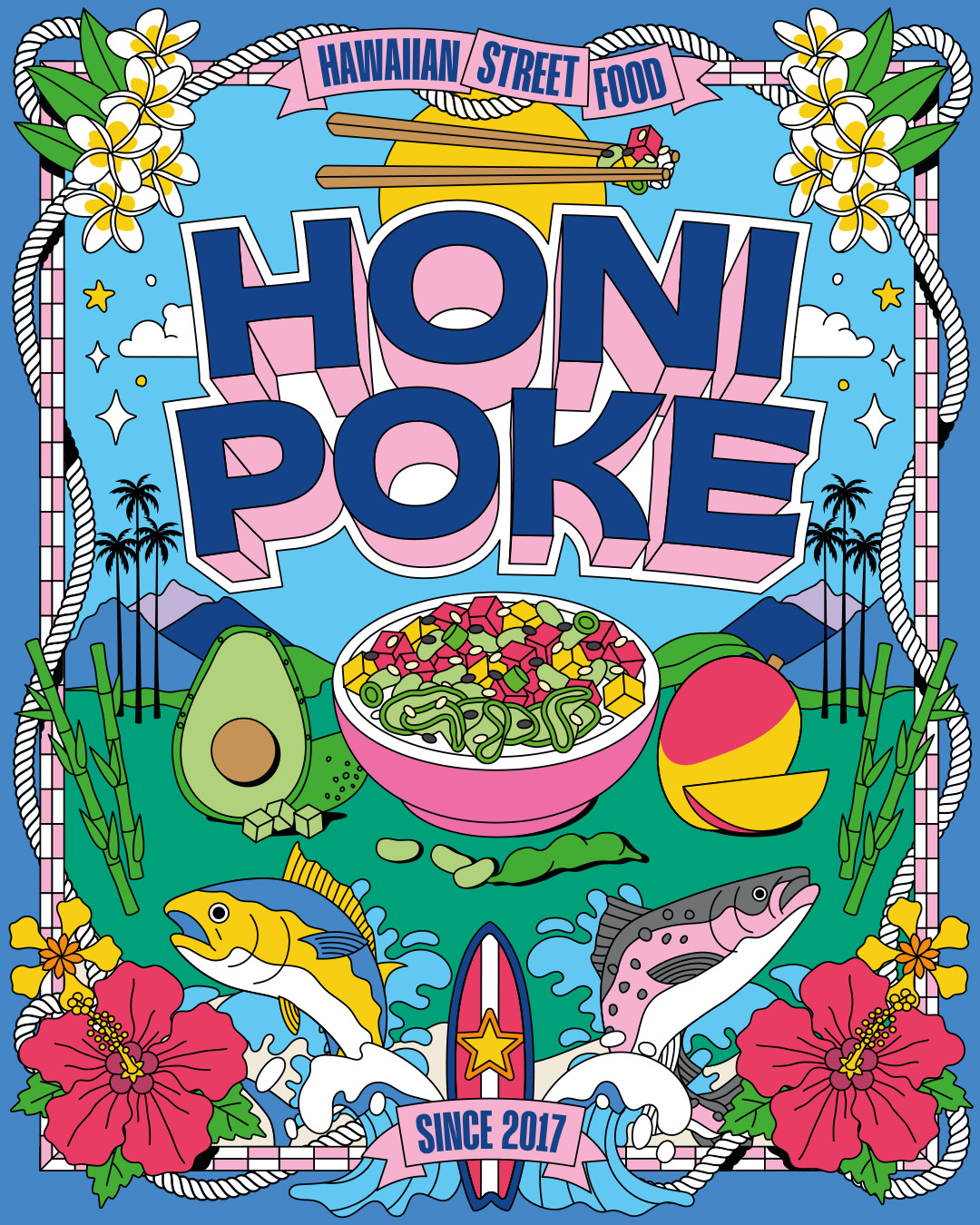 Season of Victory was commissioned to develop a dynamic illustration kit for Honi Poke, a Hawaiian-style poke bowl chain celebrated for its fresh ingredients and feel-good food ethos.